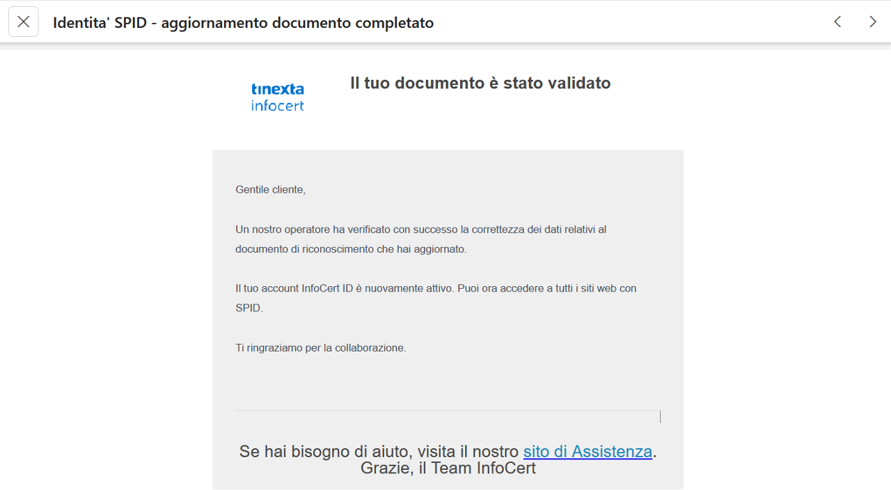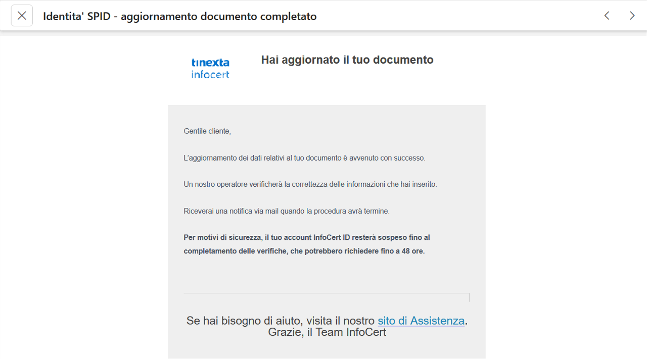Verifica la tua casella di posta (associata all'account SPID InfoCert ID) dove trovi l'email di Tinexta Infocert sull'aggiornamento del documento per SPID.