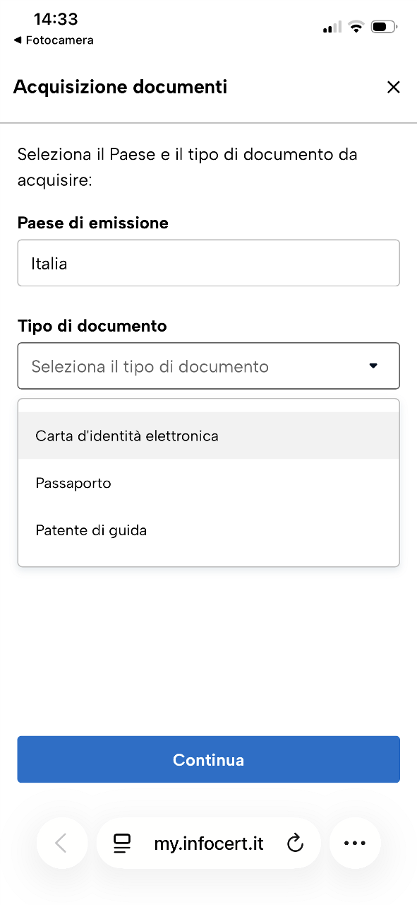 Per prima cosa viene richiesto di selezionare il Tipo di Documento, da caricare, disponibile tra quelli presenti nel menu a tendina (Carta d'identità elettronica; Passaporto; Patente di guida).