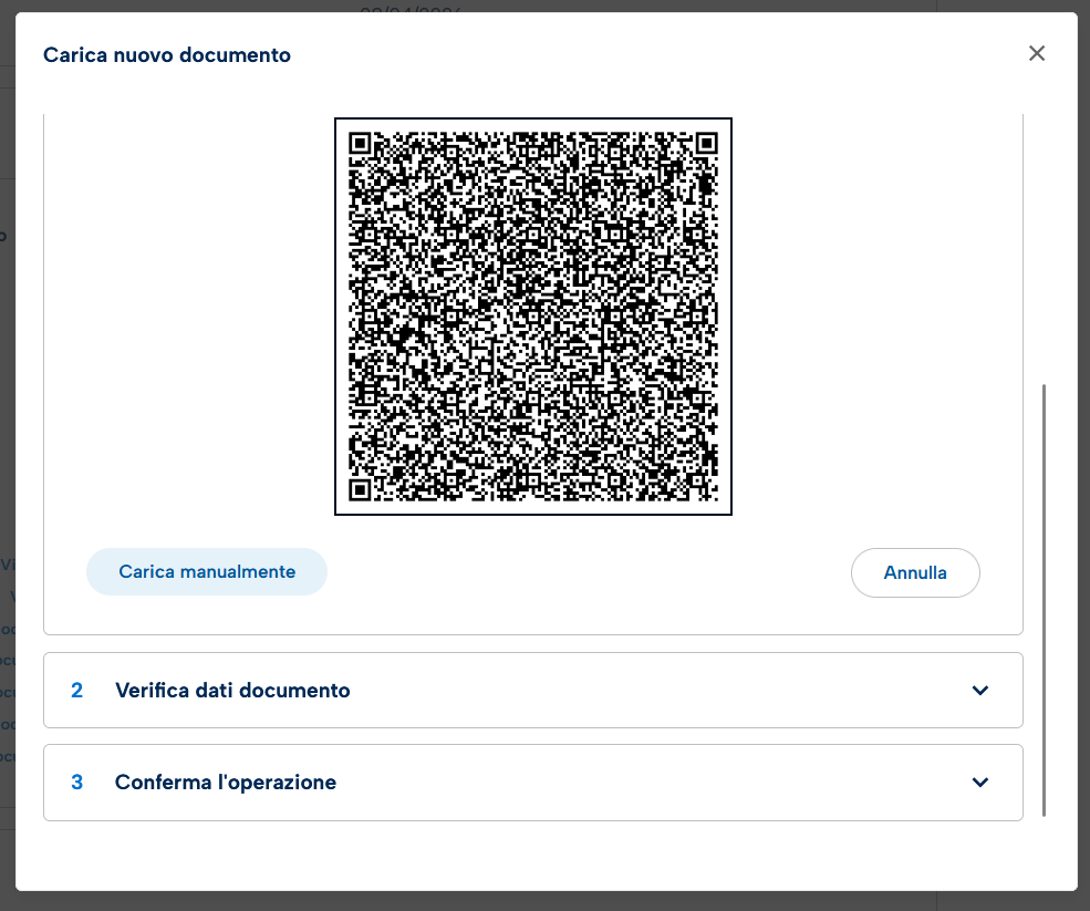 Il codice QR presente sulla pagina dovrà essere scansionato con la fotocamera del proprio smartphone, così da esser reindirizzati alla procedura di caricamento online.