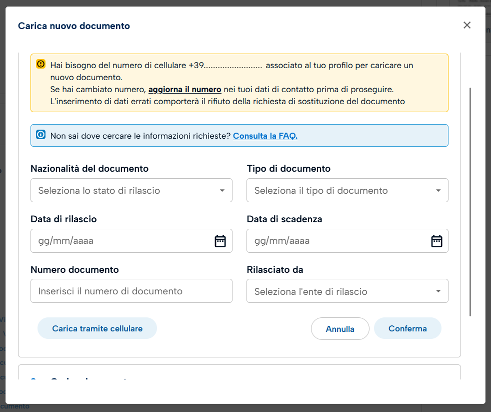 Qualora si abbia la necessità di aggiornare il Documento d'Identità, prossimo alla scadenza, è possibile intervenire utilizzando il pulsante Carica nuovo documento.
