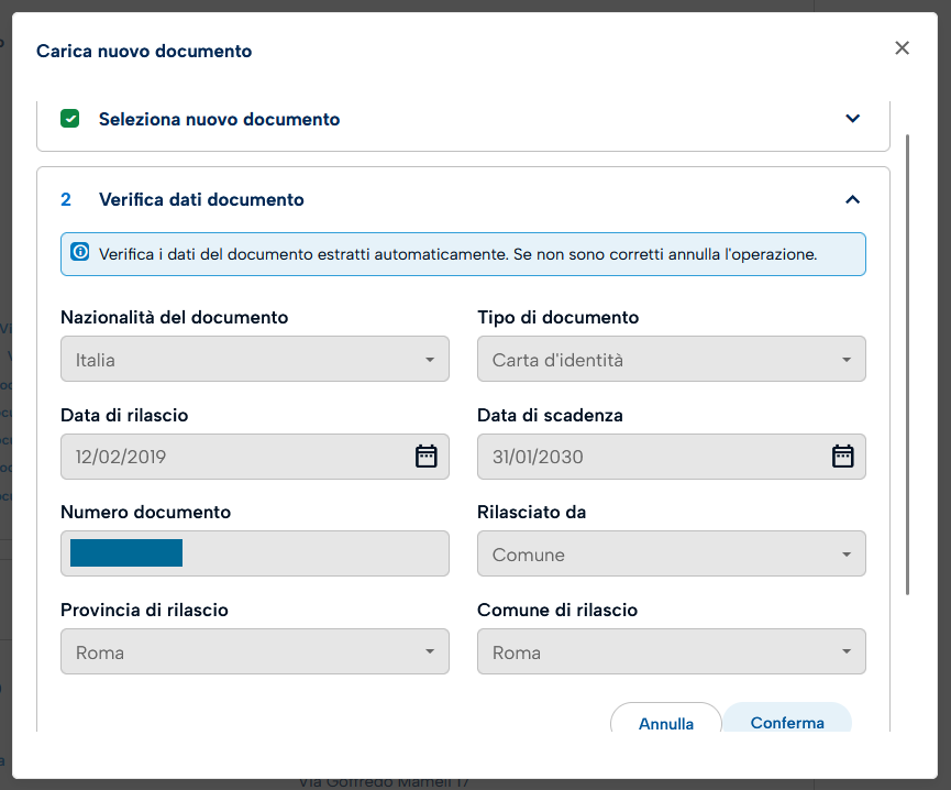 A questo punto, torna sulla pagina internet dove hai avviato la procedura sul SelfCare SPID e verifica che i dati estratti automaticamente dal software siano corretti prima di cliccare su "Conferma".