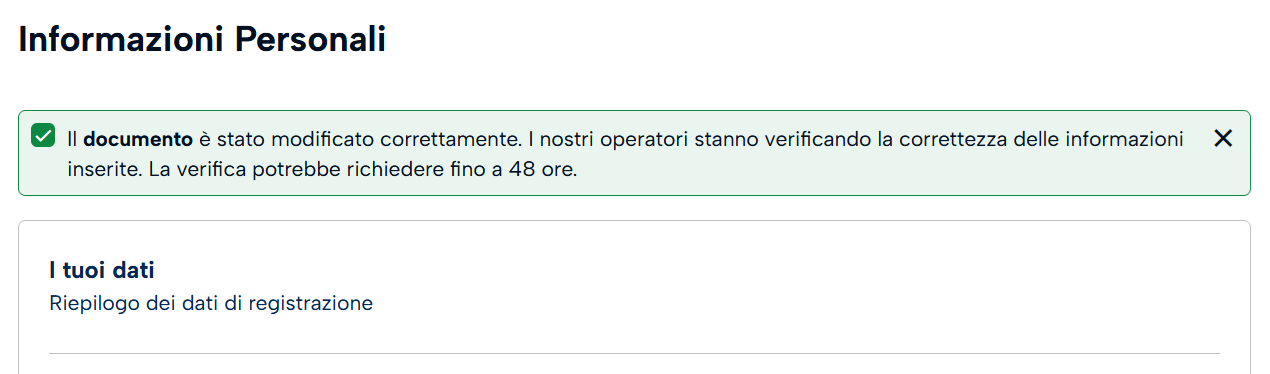 Al completamento dell'operazione di "Carica nuovo documento" sarà visibile all'interno della sezione "Informazioni Personali" l'informativa - in verde - sui tempi tecnicni necessari (fino a 48 ore), da parte degli operatori, per la verifica delle informazioni inserite.