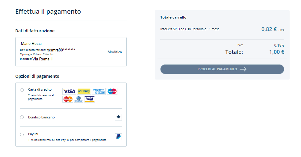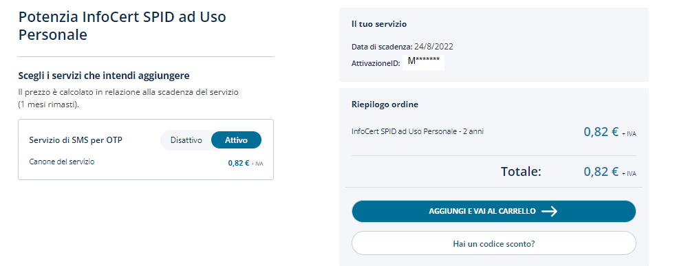 Il prezzo totale del servizio verrà calcolato in relazione alla scadenza del tuo SPID (nel pagamento verrà incluso anche il mese corrente).