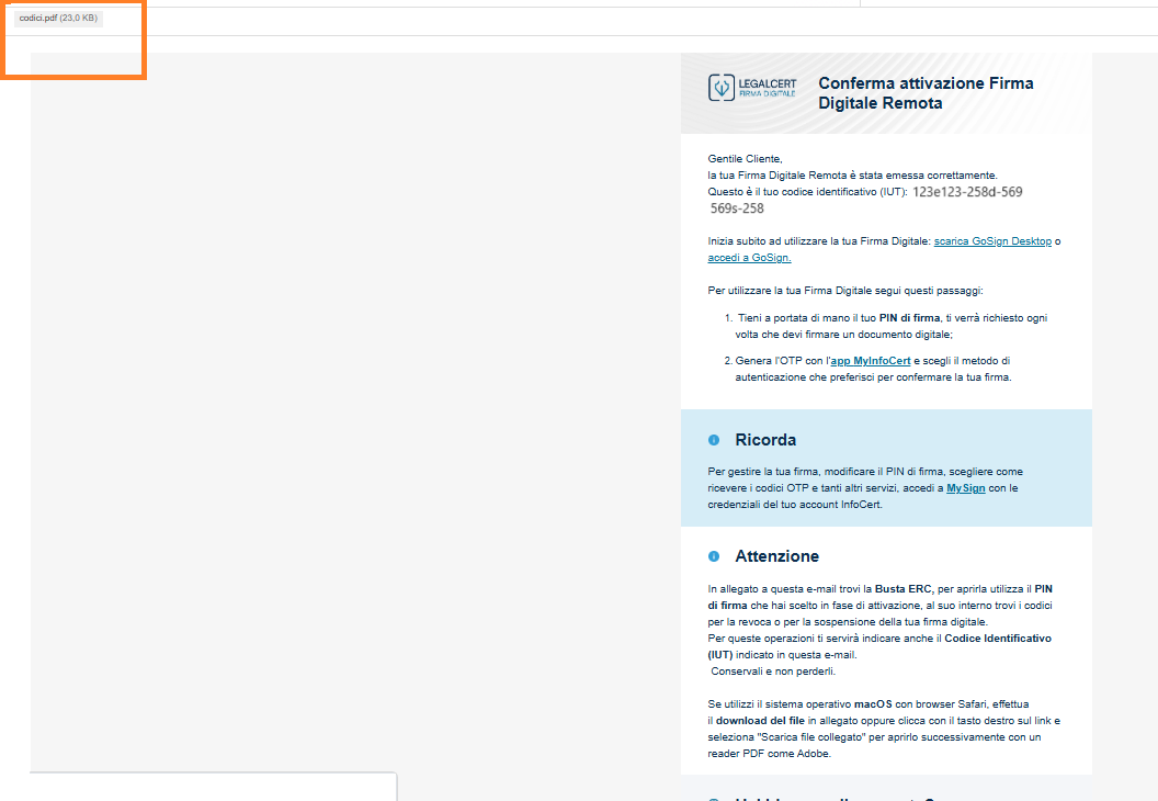 Dopo aver completato la procedura di registrazione per la richiesta di un certificato di firma digitale (remota), sulla mail associata al servizio si riceverà la conferma di attivazione della Firma Remota, contenente il codice IUT e allegata la Busta ERC.