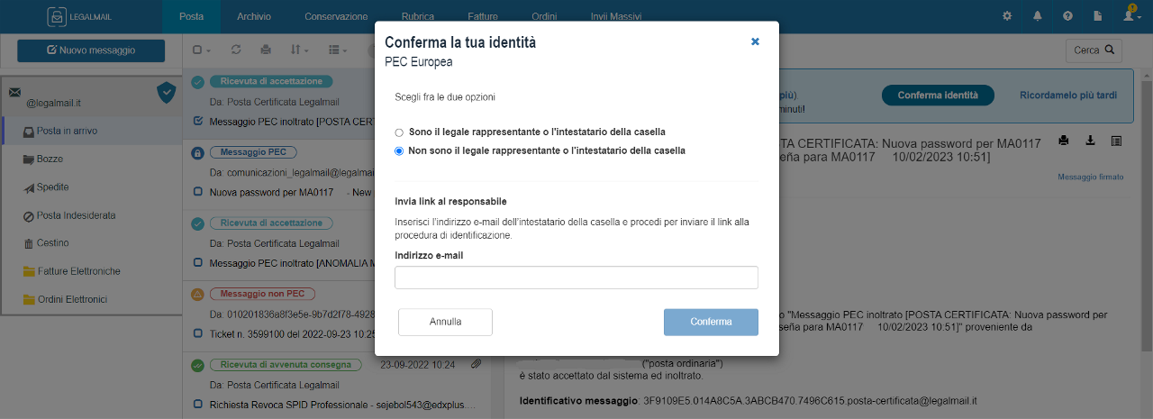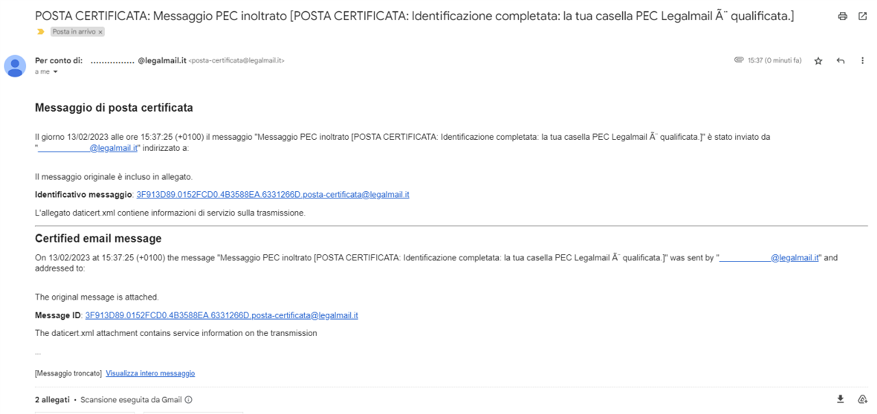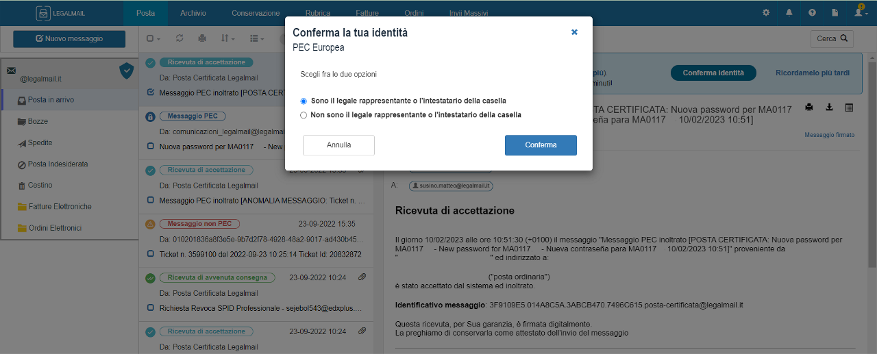 A questo punto, riceviamo sia sulla casella PEC Legalmail...