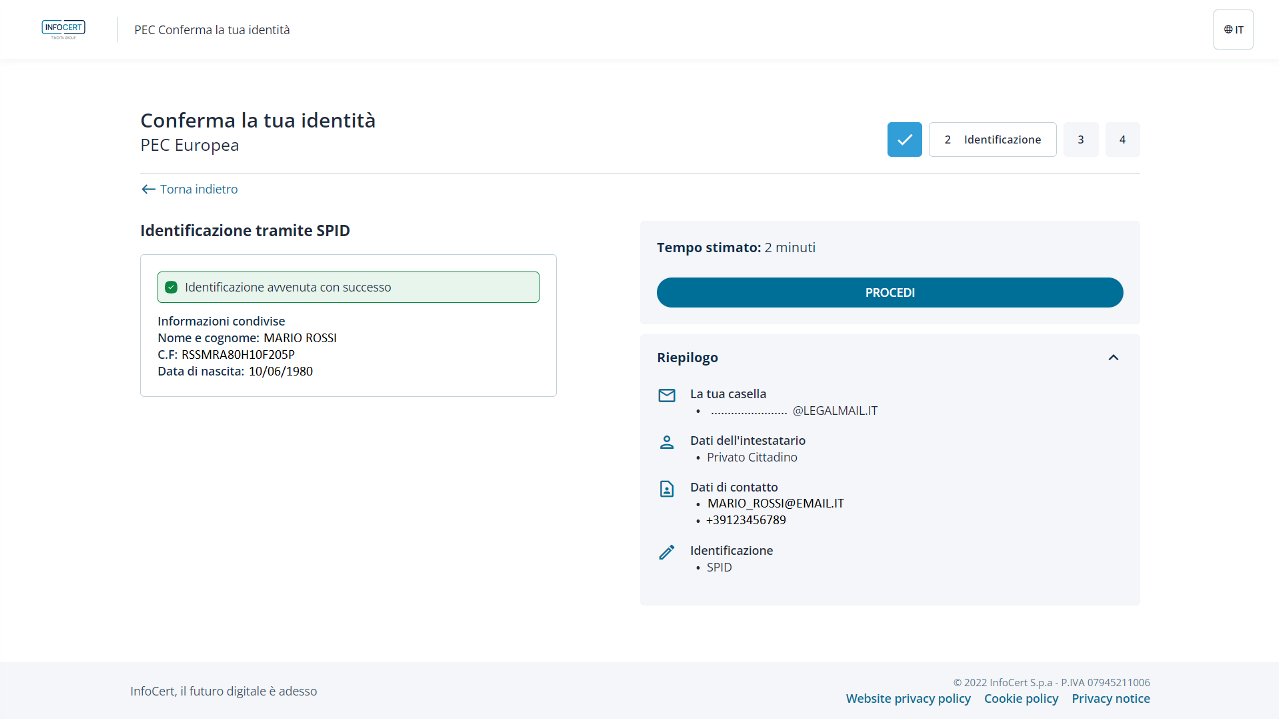 Terminato il processo di identificazione con "successo" è possibile cliccare sul pulsante "PROCEDI".
