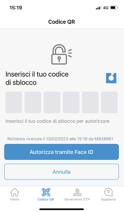 Dopo aver scansionato (tramite l'App) il QR Code della pagina, riceviamo una notifica sull'App My Infocert che ci chiede di inserire il "Codice di Sblocco" dell'App stessa (o l'autorizzazione a proseguire tramite Face o Touch ID).