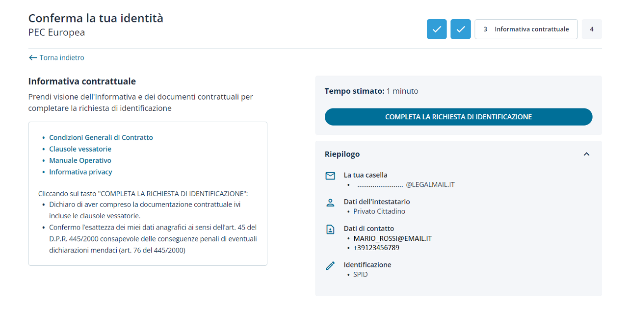 Prendere visione dell'"Informativa contrattuale" prima di completare la richiesta di identificazione.