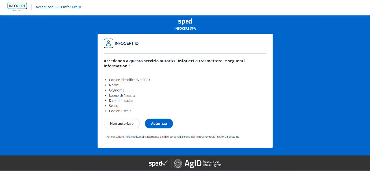 Autorizziamo InfoCert ad accedere alle informazioni riportate di seguito cliccando su "Autorizza".