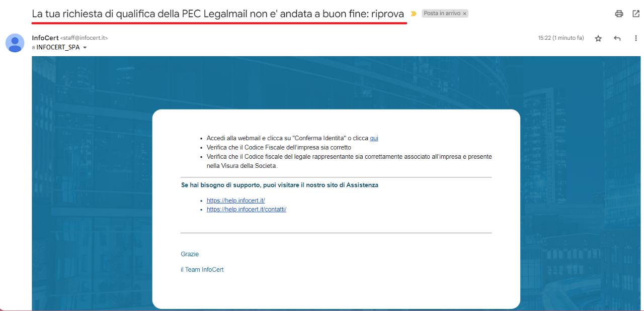 Se dovessi ricevere questo messaggio "La tua richiesta di qualifica della PEC Legalmail non è andata a buon fine: riprova" significa che sono stati riscontrati dei vizi nella procedura.