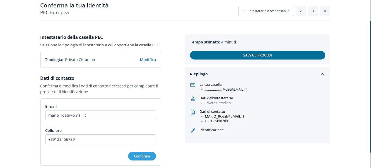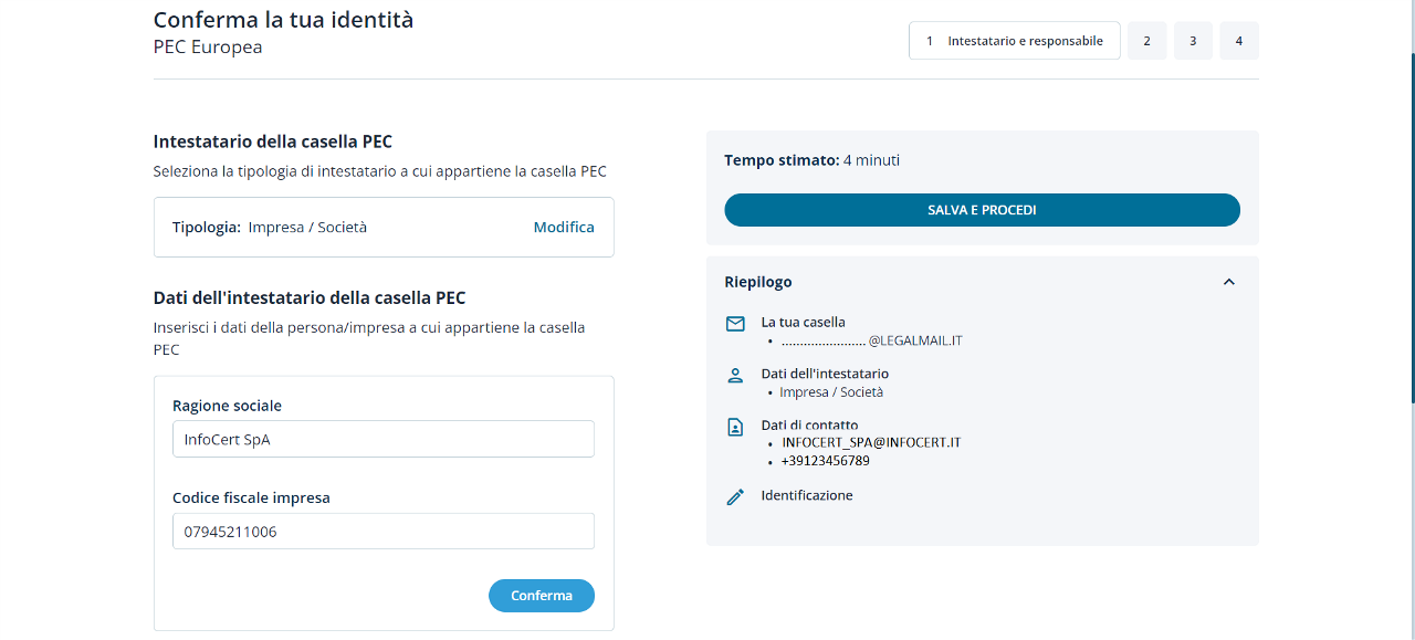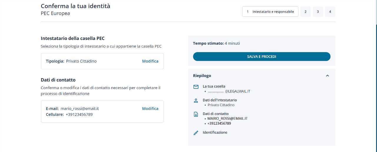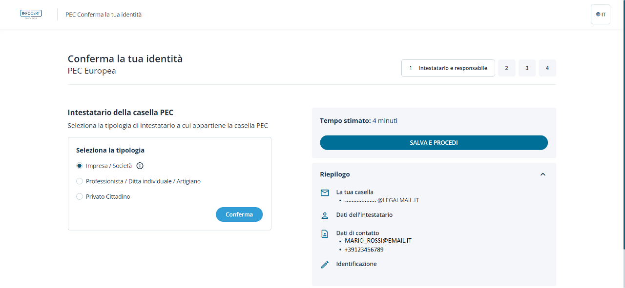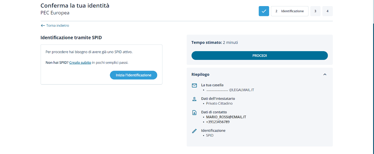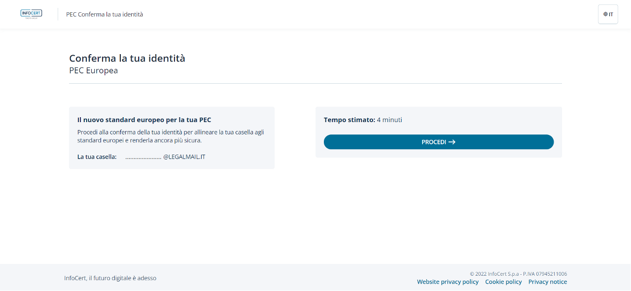 Laddove ci trovassimo nel primo caso ("Sono il legale rappresentante o l'intestatario della casella") verremo reindirizzati alla pagina per procedere con l'identificazione della casella PEC.