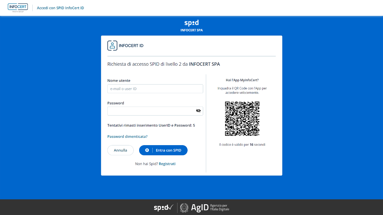Selezionando dal menù la voce "InfoCert ID" finiamo sulla classica schermata di identificazione forte (cd "Strong Authentication") a due fattori, dove sarà necessario utilizzare My Infocert, l'App SPID di InfoCert installata sul proprio cellulare.