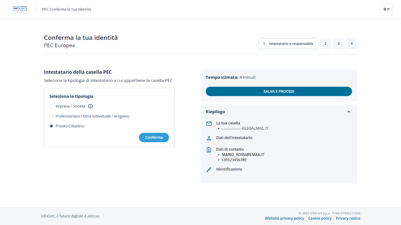 Se la casella PEC appartiene ad un Privato Cittadino, selezionare nel riquadro "Intestatario della casella PEC", la voce corrispondente e cliccare sul pulsante "Conferma".