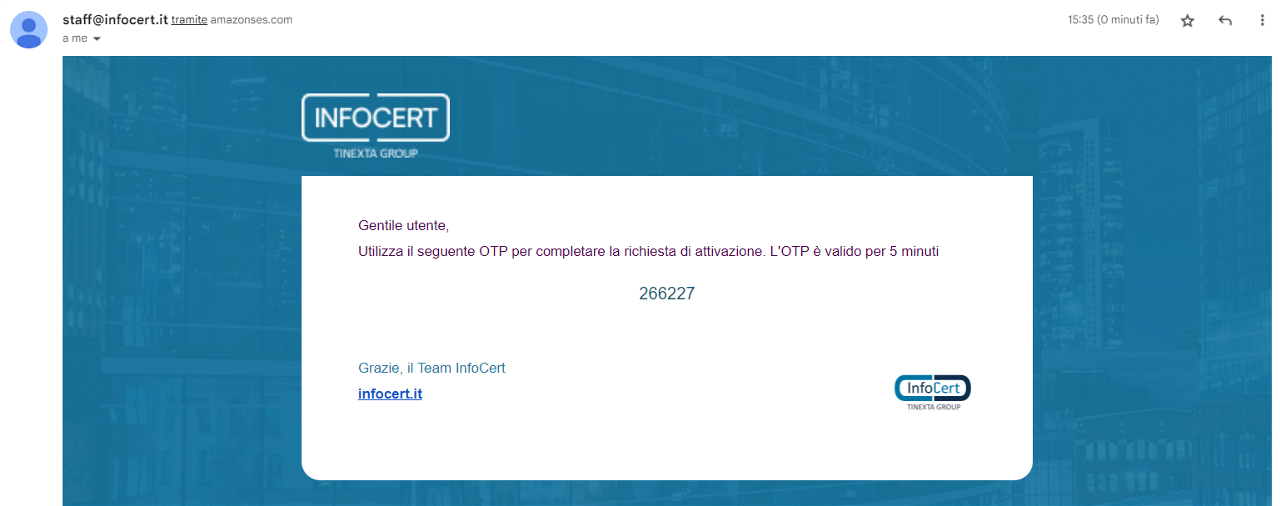 Aprendo la casella ordinaria di posta rintracciamo l'email inviata da "staff@infocert.it" dove ritroviamo il codice OTP da inserire nella schermata di sopra.