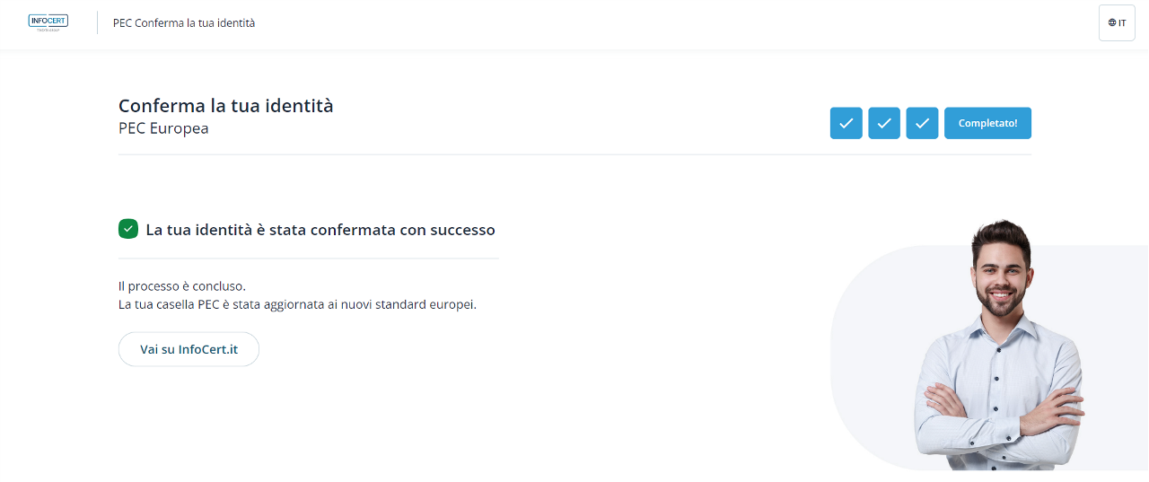 Puoi riprovare, in qualsiasi momento, l'identificazione della casella PEC accedendo alla webmail e cliccando su "Conferma Identità".