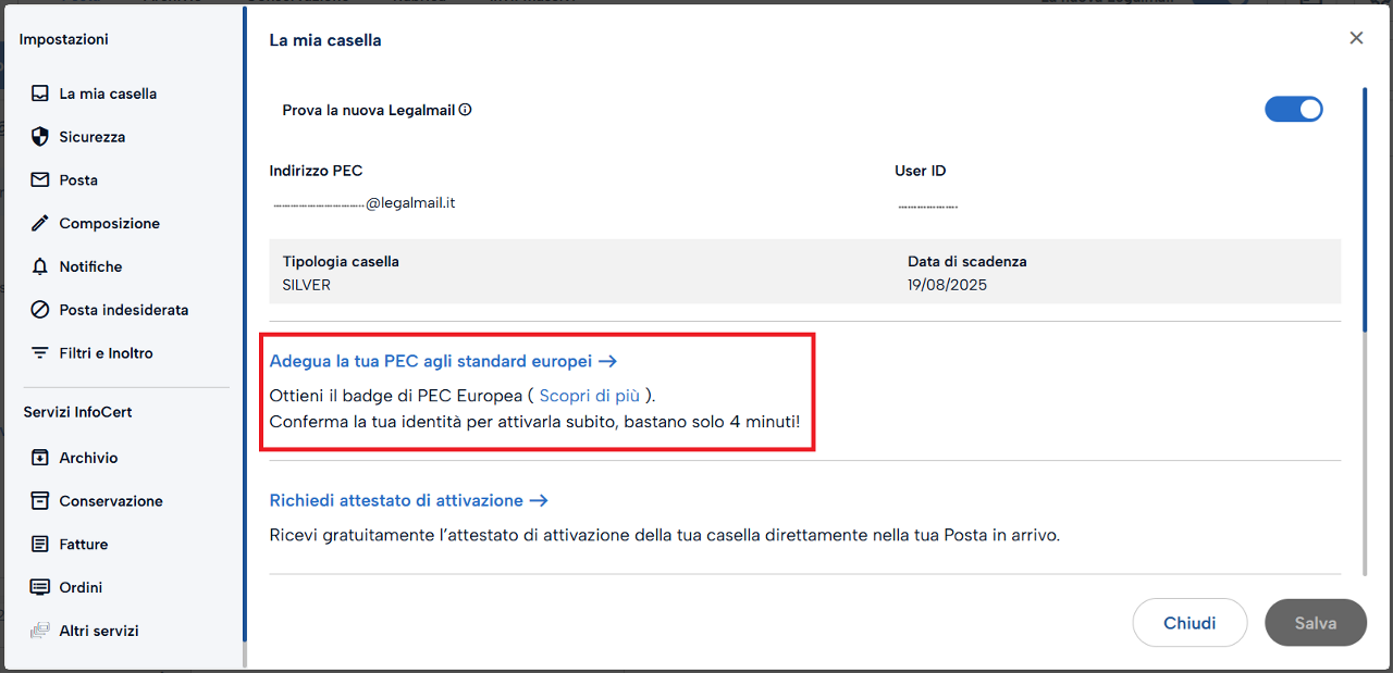 Eseguito il login alla casella PEC troviamo in sovraimpressione il messaggio che ci invita ad adeguare la PEC agli standard europei.