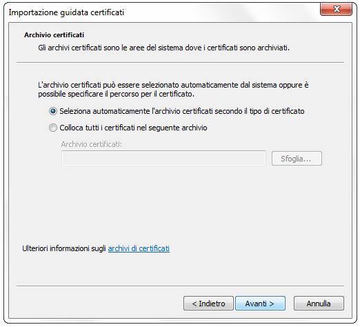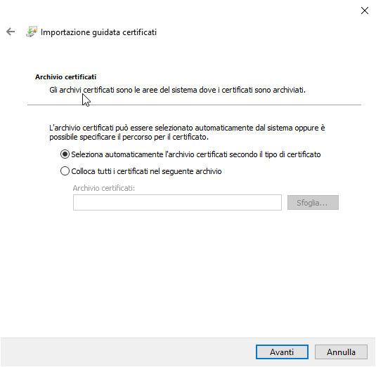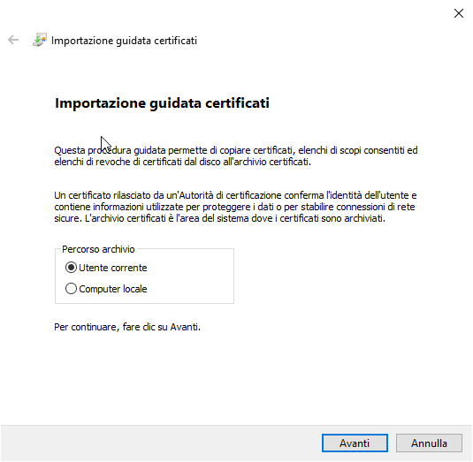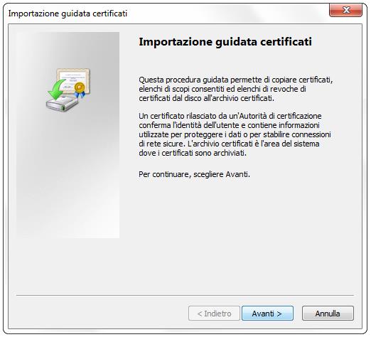 In questo modo si accede alla procedura guidata di installazione dei certificati, che sarà possibile avviare con un clic sul pulsante Avanti.