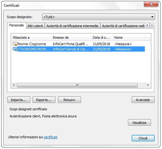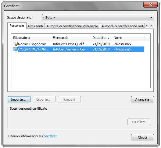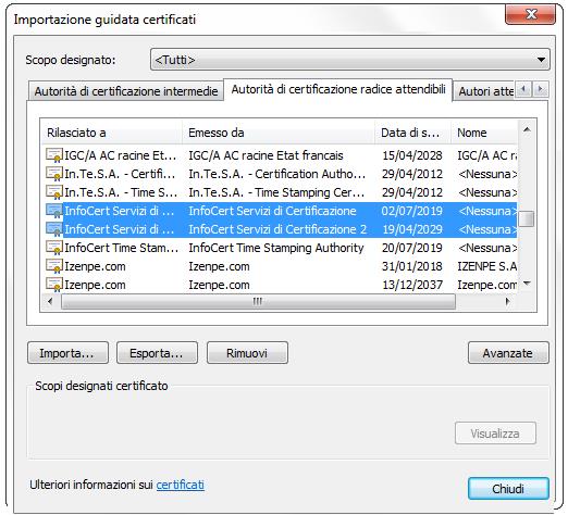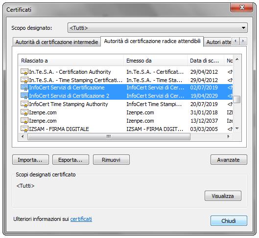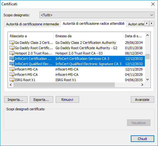 Qui, nell’area Autorità di certificazione radice attendibili, scorrendo l’elenco si dovrà trovare sia il certificato CA InfoCert Servizi di Certificazione che il certificato CA InfoCert Servizi di Certificazione 3.