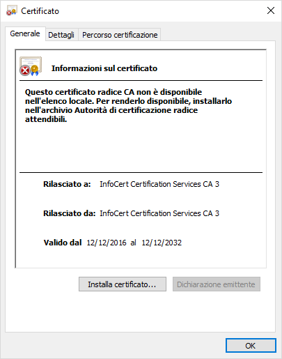Ripetere la stessa sequenza di operazioni anche per il secondo certificato di root, certificato CA InfoCert Servizi di Certificazione 3.