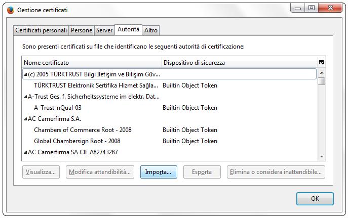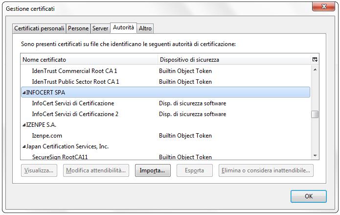 Se si utilizza Mozilla Firefox, basta controllare che nell’elenco delle Autorità di Certificazione presenti all’interno della sezione Autorità ci siano i certificati di root InfoCert.