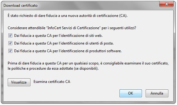 Confermare l’attendibilità del certificato CA InfoCert Servizi di Certificazione selezionando tutte e tre le opzioni di richiesta fiducia presenti e procedere con un clic sul pulsante OK.