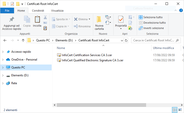 Individuare la cartella all’interno della quale sono stati salvati i due certificati di root InfoCert e aprire il certificato CA InfoCert Servizi di Certificazione con un doppio clic.