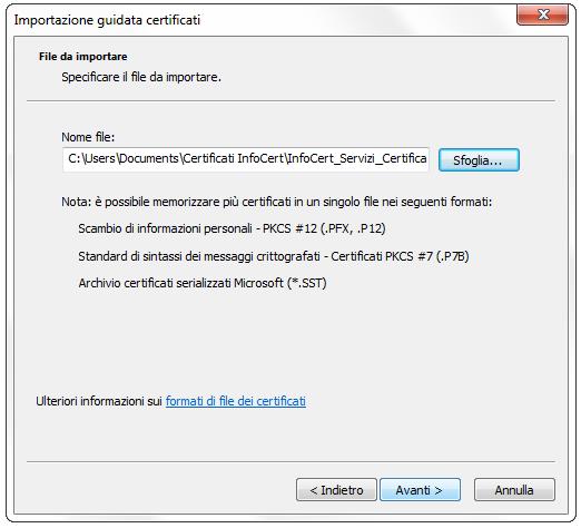 Con un clic sul pulsante Sfoglia individuare la cartella all’interno della quale sono stati salvati i due certificati di root InfoCert, selezionare il certificato CA InfoCert Servizi di Certificazione e confermare con un clic sul pulsante Avanti.
