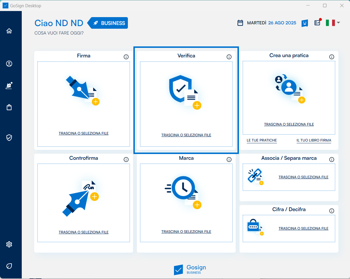 All'avvio di GoSign Desktop fare clic sul riquadro "Verifica" per selezionare, dalla vostra directory del PC, il file di vostro interesse sul quale volete verificare la presenza (o meno) di firme digitali.