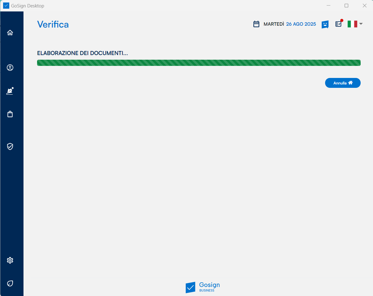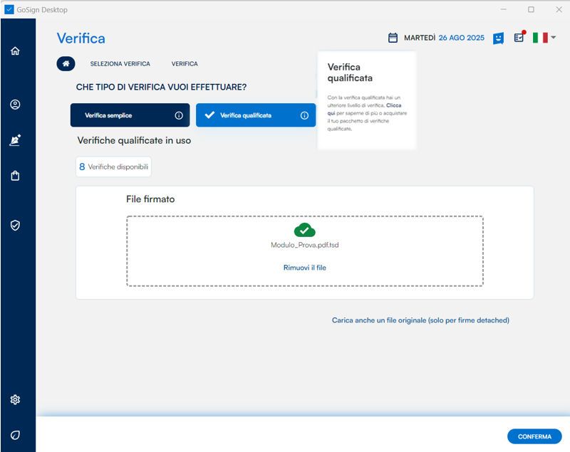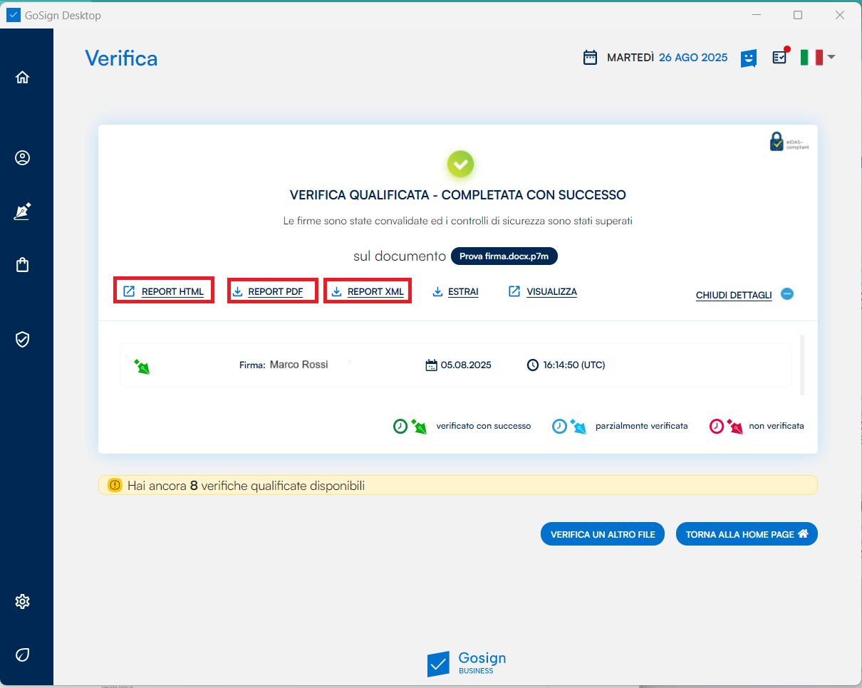 Con la nuova funzionalità di GoSign Desktop di "Verifica Qualificata", conforme al regolamento eIDAS, puoi certificare firme elettroniche, sigilli e marche temporali con un report di verifica sigillato da InfoCert.