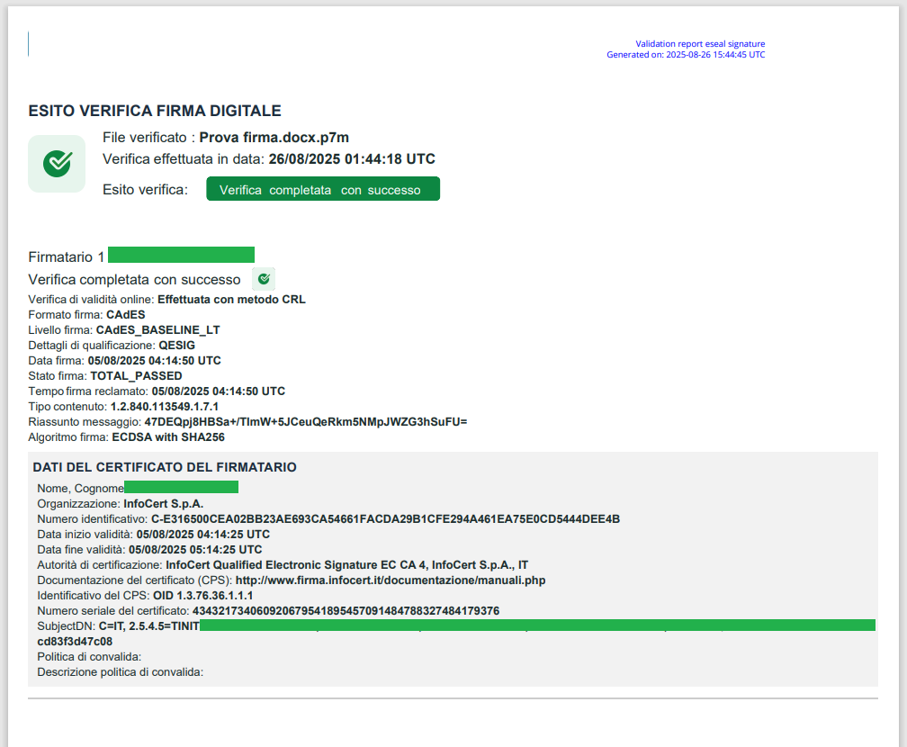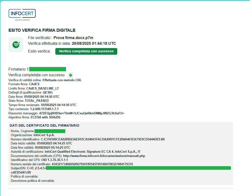 Il report di Verifica Qualificata è una certificazione emessa da un QTSP (Qualified Trust Service Providers) come InfoCert che garantisce ufficialmente il risultato della verifica. Inoltre, ha piena validità legale e offre una prova inconfutabile della verifica effettuata, garantendo la massima sicurezza e affidabilità per i tuoi processi aziendali.