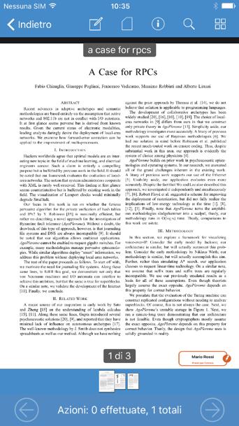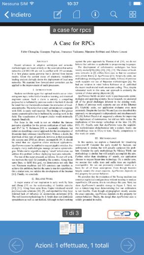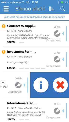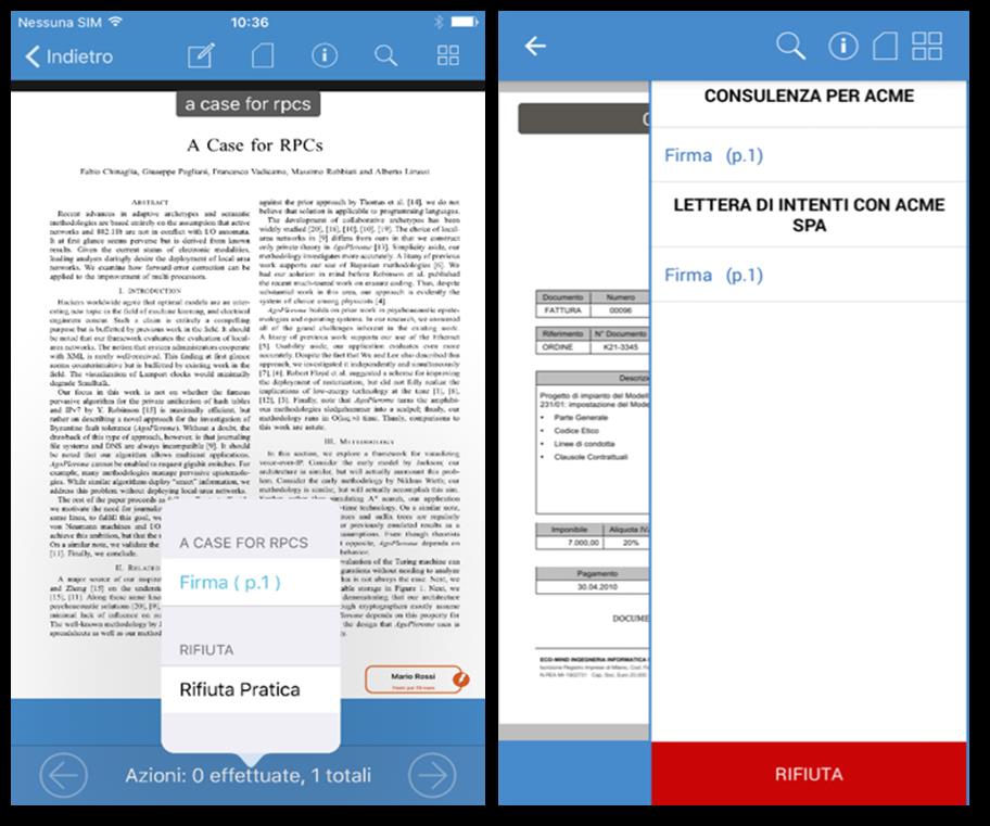 Selezionando una pratica (tap sulla riga), accedo alla pagina di lavorazione (pagina di conferma delle azioni richieste). Il sistema mi permette di visualizzare la pagina del primo documento della pratica in cui è necessario compiere un’azione (firma, approvazione o visto). E’ possibile sfogliare tutti i documenti di una pratica in continuità semplicemente sfogliando le pagine in sequenza (finito un documento viene presentato quello successivo).