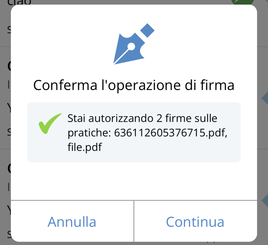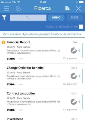 Questo diverso meccanismo serve per evidenziare che l’operazione che sto per compiere non è una semplice sincronizzazione/approvazione ma la firma del documento. È possibile firmare più documenti all’interno di un’unica sessione di sincronizzazione. In base al livello di autorizzazione definito per la pratica, il sistema richiede il PIN come conferma di riconoscimento o il PIN e l’OTP del certificato digitale. Nel caso ci siano diverse pratiche da firmare, con differenti livelli di autorizzazione, il sistema richiede le credenziali per i diversi metodi di firma.