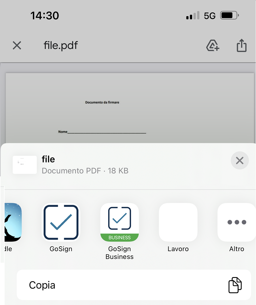 È possibile scegliere un file da firmare dal proprio dispositivo e aprirlo con GoSign Business Mobile attivando direttamente la funzione di firma e invia.