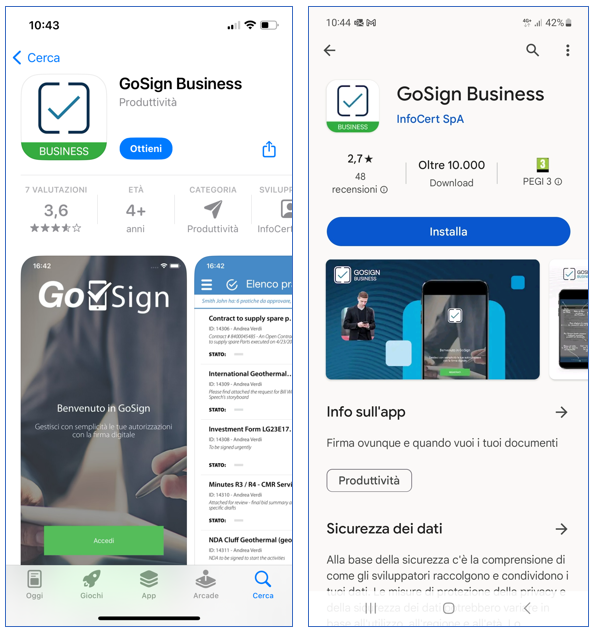 Una volta avviato Google Play, Apple Store o Microsoft Store, inserire "GoSign Business" come elemento di ricerca. Un clic sul pulsante Installa o Ottieni (in base al sistema del proprio cellulare) permette di proseguire ed installare l’App.