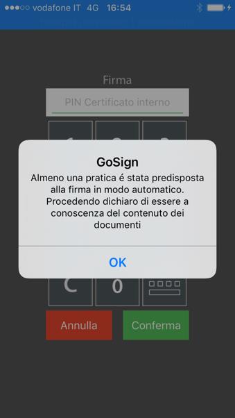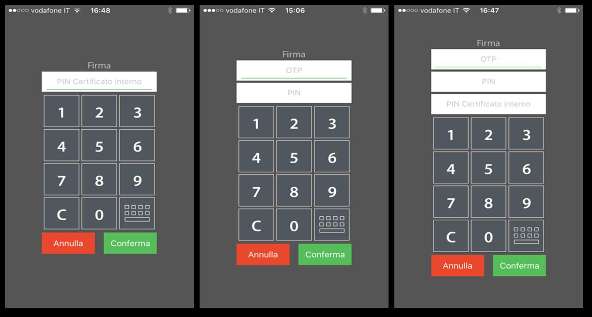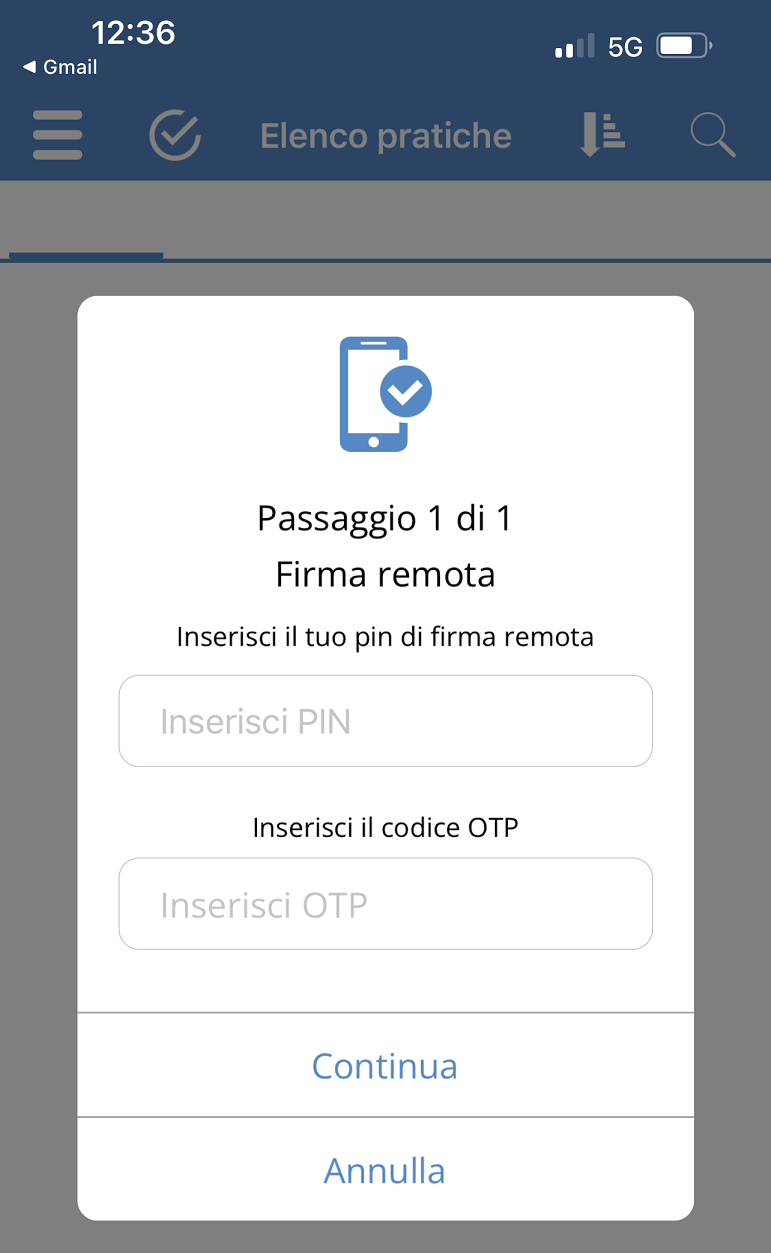 Un tocco sul tasto Continua permetterà di aggiungere il proprio PIN di Firma e l’otp ricevuto via sms.