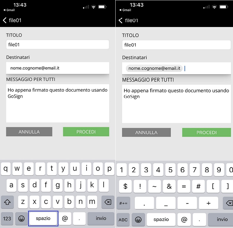 Dopo aver inserito l'e-mail del destinatario sarà necessario cliccare sul tasto spazio/tab affinchè venga riconosciuto dall'applicazione.