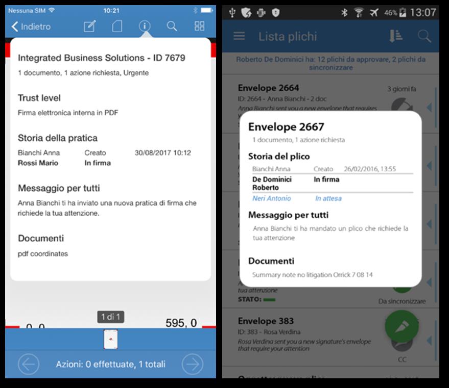 L’azione di firma è al momento nello stato “predisposta”: l’effettiva apposizione della firma avviene, infatti, al momento della sincronizzazione, quando è richiesta la procedura di riconoscimento in base al livello di autorizzazione impostato. Le firme inserite, fino a quando non è eseguita una sincronizzazione, possono essere cancellate e inserite nuovamente in caso di errore. La raccolta delle firme può avvenire in un’unica sessione o in momenti diversi. È inoltre possibile sincronizzare l’applicazione sul tablet con il Server senza aver necessariamente terminato l’iter di sottoscrizione di una pratica. Il server ospita le azioni effettuate fino al momento della sincronizzazione.