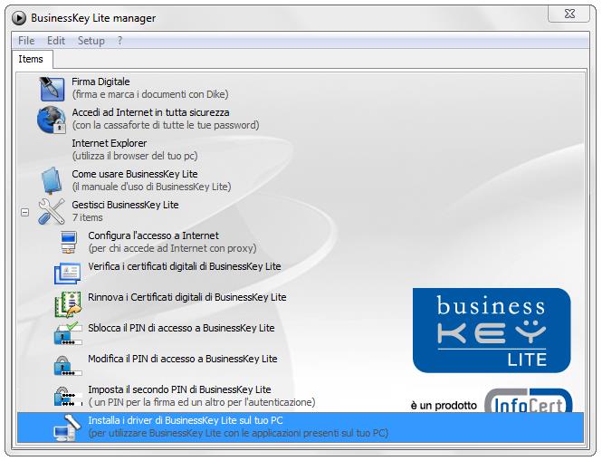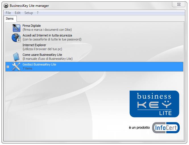 Un doppio clic sul comando Gestisci BusinessKey Lite permette di accedere alle funzioni di gestione della Business Key.
