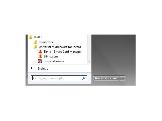 Per verificare la corretta installazione del modulo CSP, controllare che all’interno del menu Start del proprio computer sia presente la cartella Bit4ID e far partire il Bit4ID – Smart Card Manager con un clic.