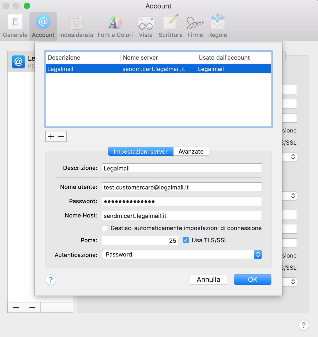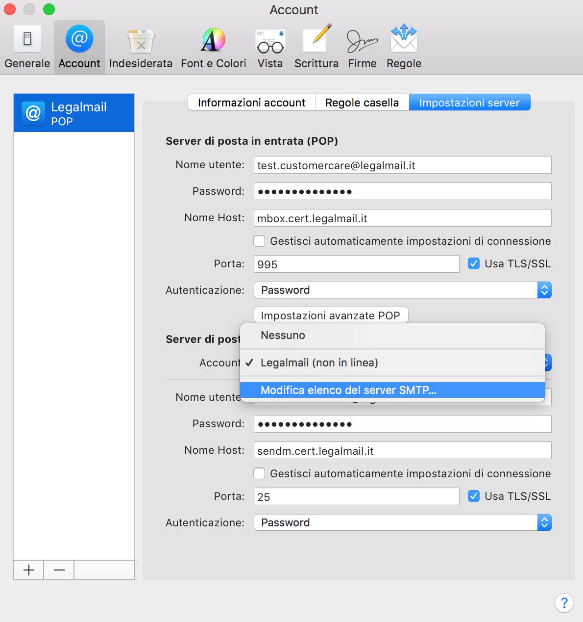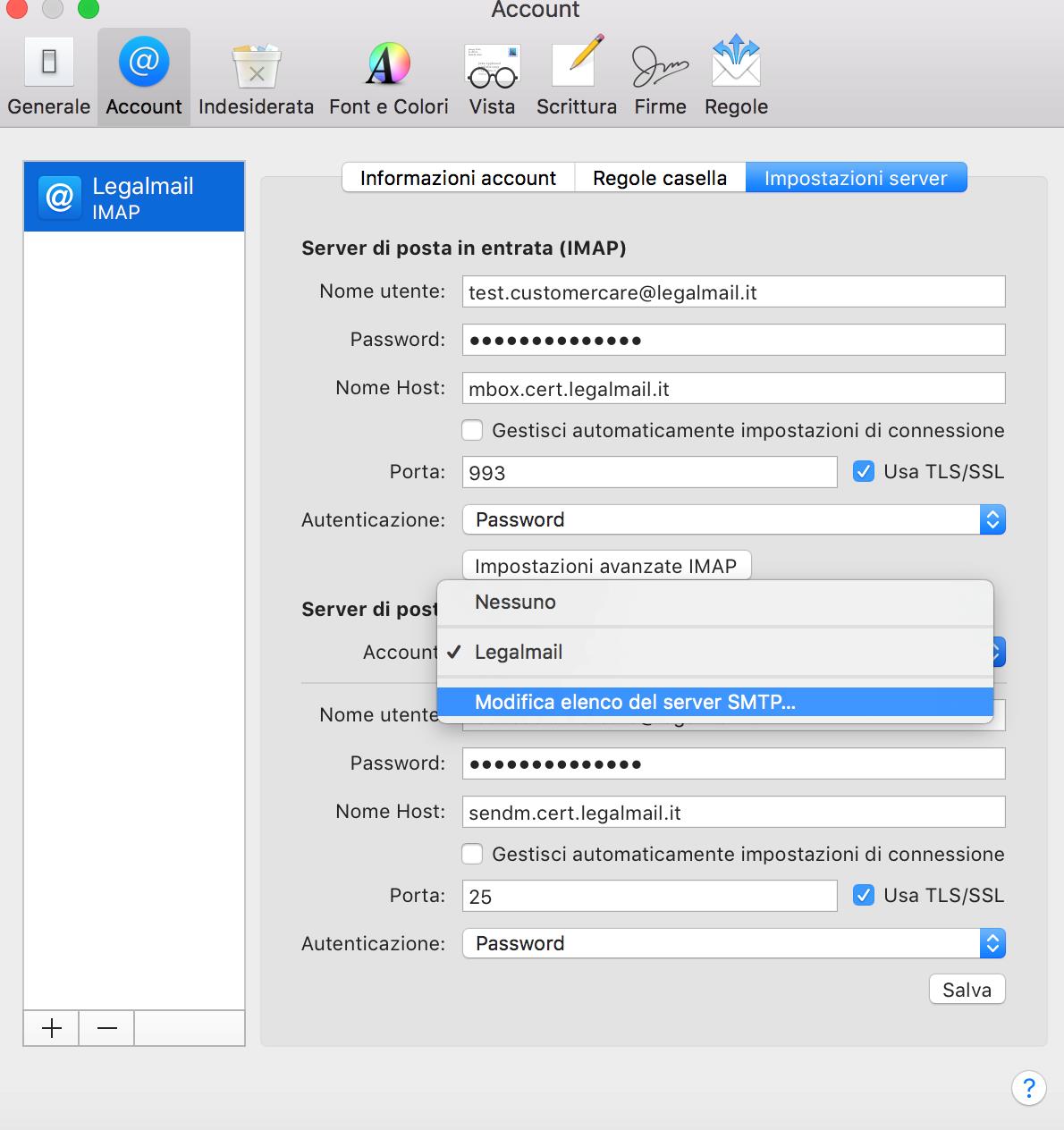 E’ possibile verificare anche la configurazione del server di posta in uscita. La casella Legalmail prevede necessariamente l’utilizzo del server sendm.cert.legalmail.it e una possibile altra opzione selezionabile dal menu è Modifica elenco del server SMTP.