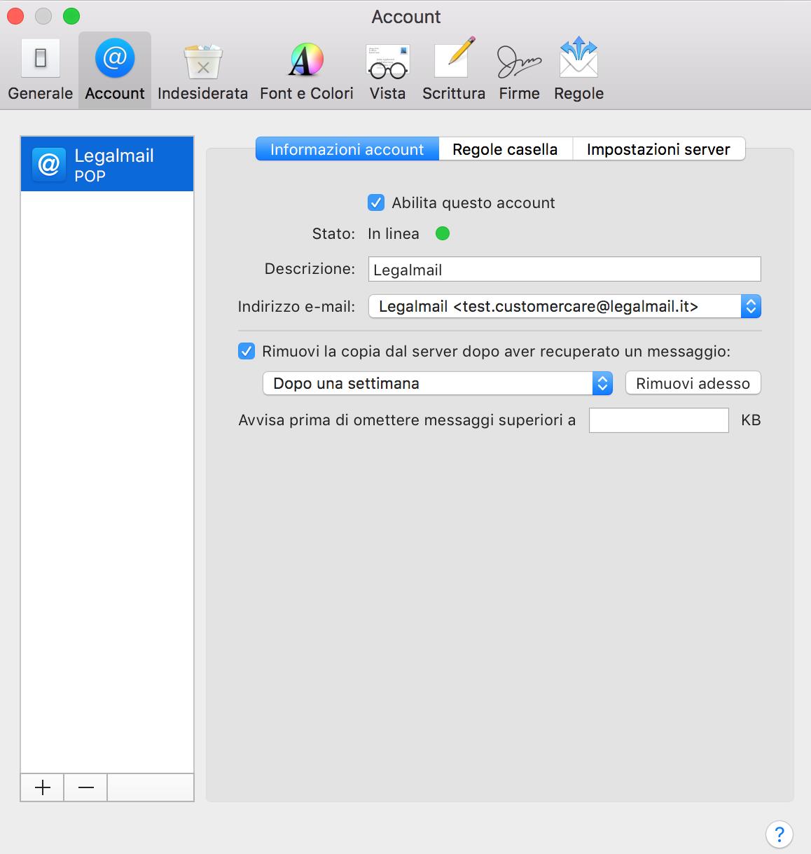 Nella scheda Account posso prendere visione delle Informazioni account inserite, con particolare attenzione alla sezione relativa alla rimozione dal server dei messaggi