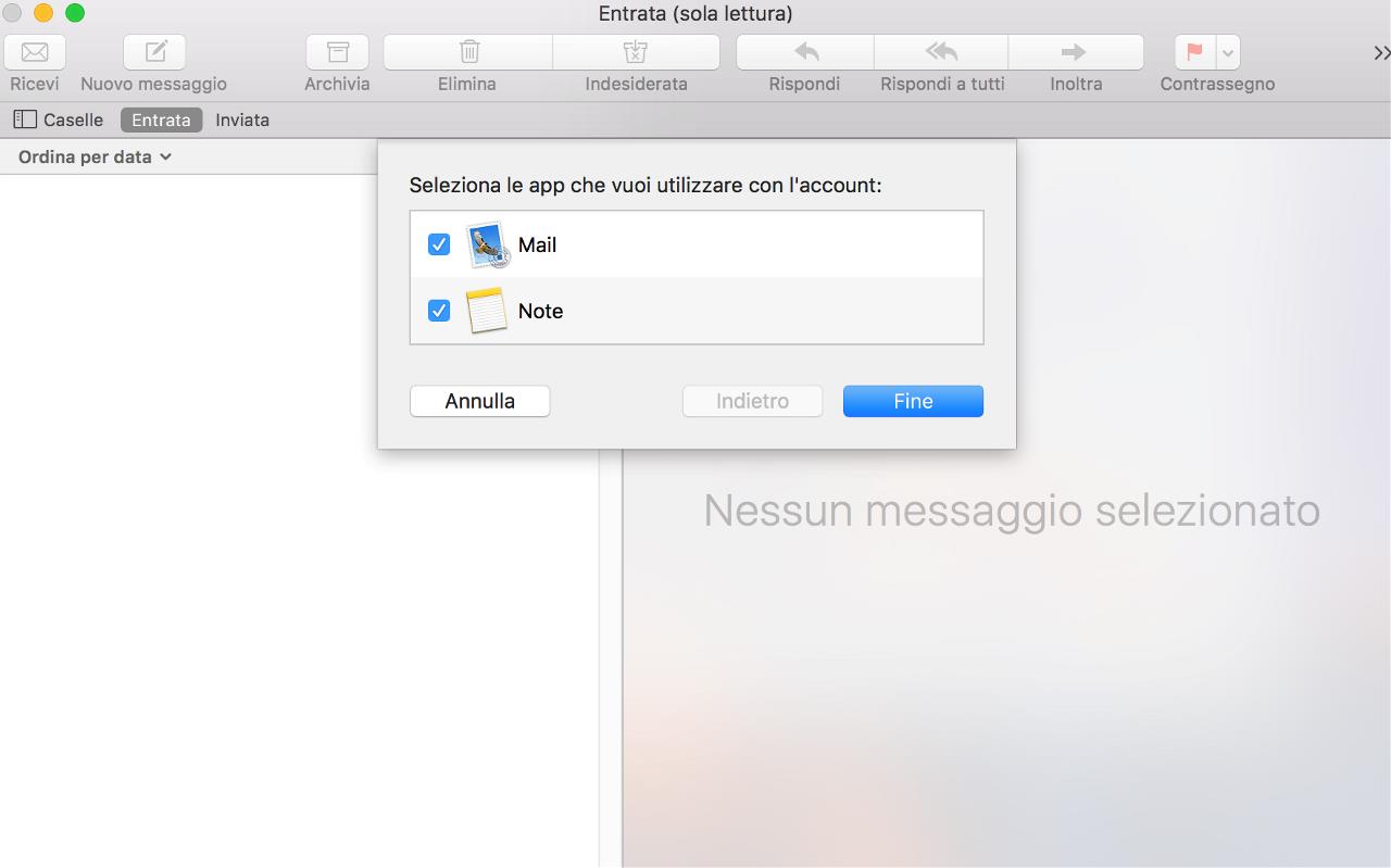Procedo con un clic sul pulsante Accedi. La mia casella PEC risulterà configurata sul client Apple Mail e potrò ricevere/inviare messaggi di posta certificata. Il programma, infine, mi chiederà di selezionare le App con le quali utilizzare l’account appena creato.