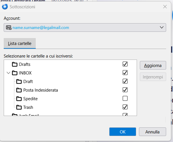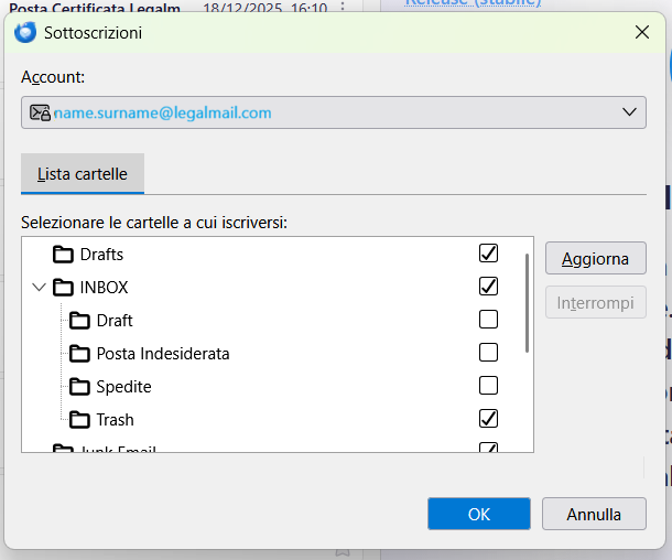 Per consentire la sincronizzazione delle sotto-cartelle della mia webmail all'interno del client, evidenzio l'indirizzo di posta della mia casella e procedo con un clic sul pulsante destro del mouse dopo aver selezionato la voce Sottoscrivi.