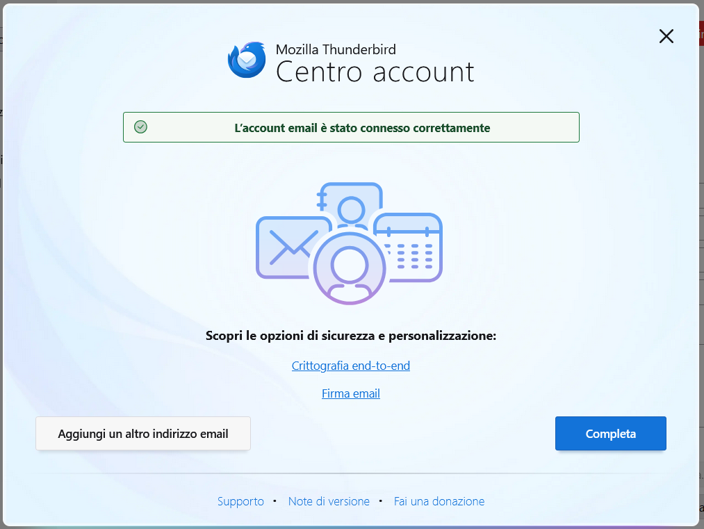 L’account di posta è stato collegato correttamente. Fare clic su Completa.