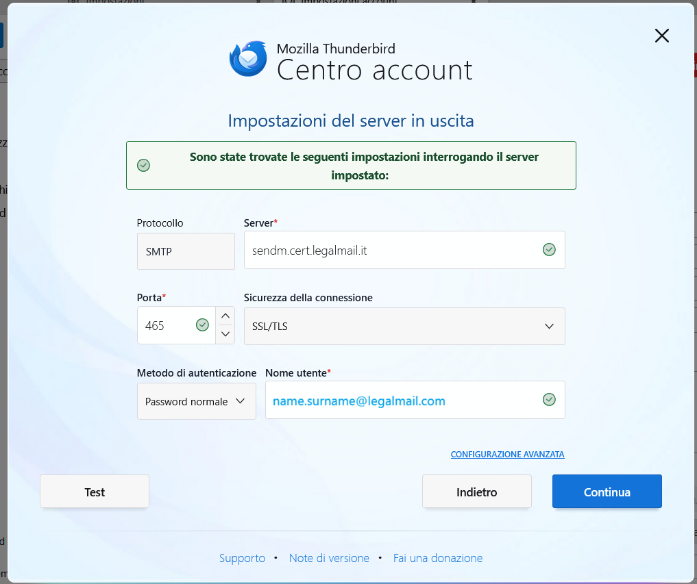 Il sistema esegue una verifica automatica dei server e di seguito mi permette di selezionare l'opzione IMAP nel campo In entrata.