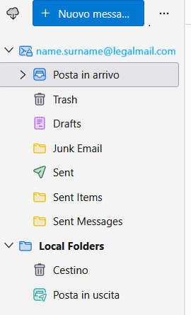 Il nuovo account di posta creato è visibile sul lato sinistro dello schermo.