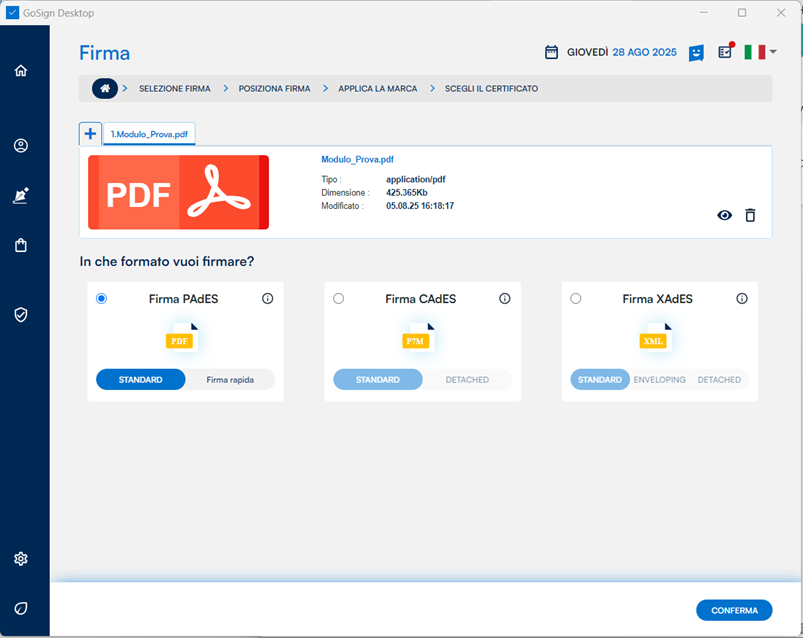 Successivamente, sarà possibile scegliere la tipologia di firma con cui firmare e, una volta selezionata, un click su Conferma porterà al passaggio successivo.