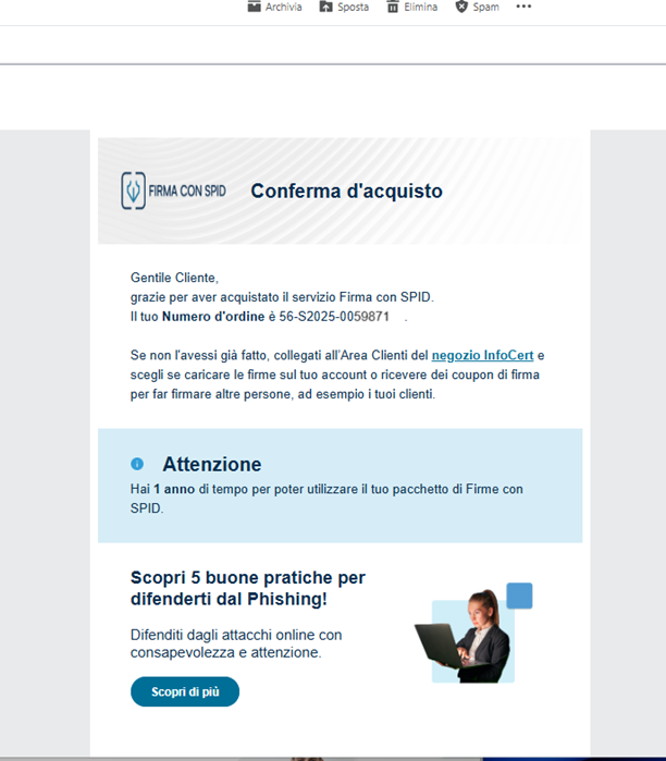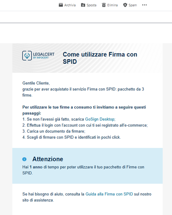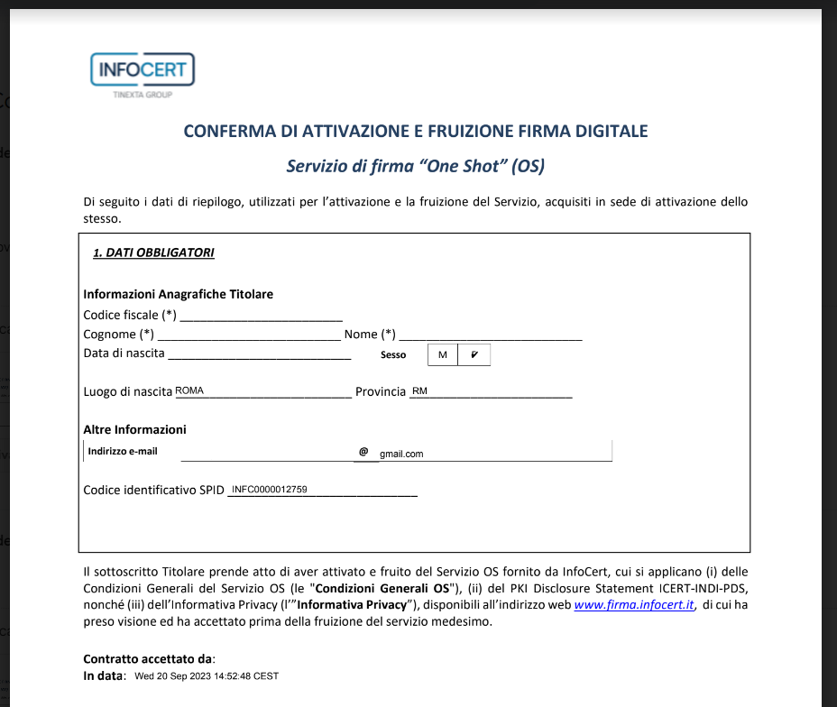 Sull’indirizzo di posta precedentemente inserito e confermato, si riceverà la mail contenente il contratto relativo alla richiesta di firma.