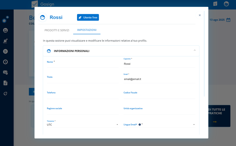 Completato la fase di accesso, verrà visualizzata la pagina contenente i servizi collegati alla propria utenza, tra cui il pacchetto di firme one-shot e l’account web di GoSign in versione Free.