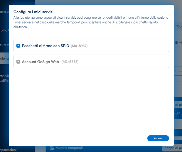 Il servizio “Firma con Spid” appena acquistato sarà visualizzabile all’interno del menu nella voce I miei servizi.